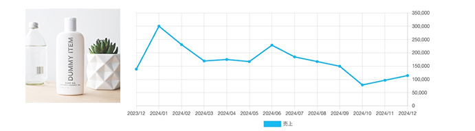 特定の商品について、直近13ヶ月分の売上推移をひと目で確認できます。 これにより、商品の成長状況や季節ごとの売上傾向を把握しやすくなり、販促や在庫計画にも役立ちます。