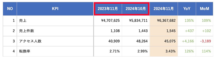 各月の数値に対して、自由にコメントを記録できます。施策の実施内容や外的要因を紐づけて残すことで、数値の変化をより深く振り返ることが可能になります。メモを残すことでチーム内での情報共有にも役立ちます。