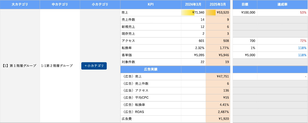 カテゴリ単位でのKPI目標設定と達成率の可視化